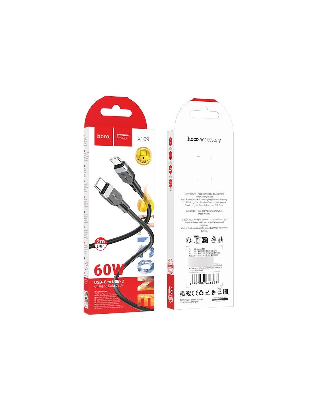 ✔ Cable USB-C a USB-C Hoco X109 Energy de 2 m — ideal para cargar y sincronizar dispositivos con puerto USB-C.