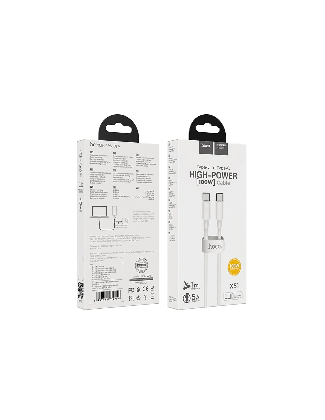 ✔ Cable USB-C a USB-C Hoco X51 con carga rápida de hasta 100 W (20 V/5 A), ideal para energía intensa y cargas exigentes.